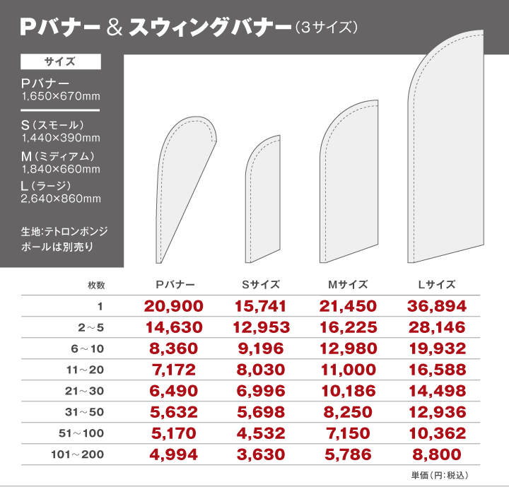*Pバナー専用ポールは1本4,389円(税込)。スウィングバナー専用ポールは全サイズ1本2,178円(税込)。