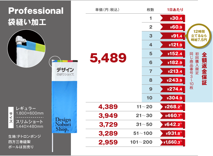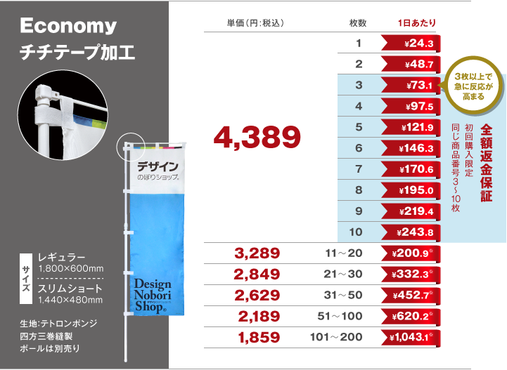 *1日あたりの金額は180日使用した際の日割り=のぼり旗の一日あたりの損益分岐点。※最小枚数の金額。