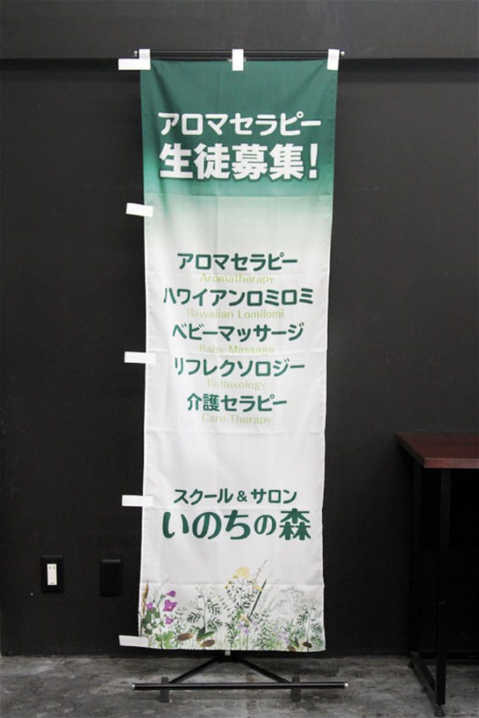 個別指導学習塾、ピコントさまの スリムショートサイズ&袋縫い加工ののぼり旗です。 なお、イラストとロゴマークはお客さま支給です。 ロゴのクオリティーが高いだけで出来上がりがグッと良くなるとおもいます。