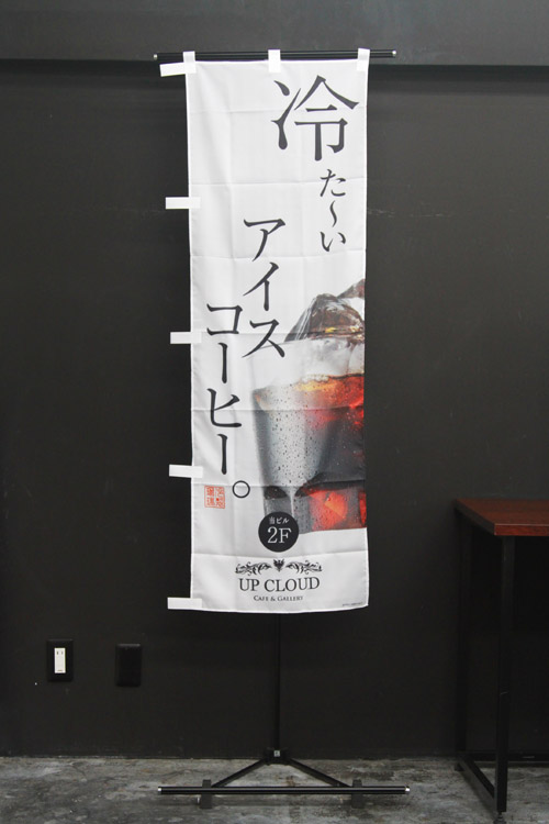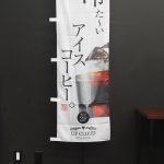 真紅ののぼり旗がまばゆいです。のぼり旗を立てる立地によっては、ただシンプルに文字を置くことも効果があると思います。