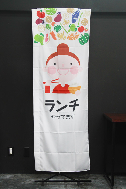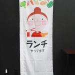 背景が3色展開ののぼり旗でカフェの要素がイラストで