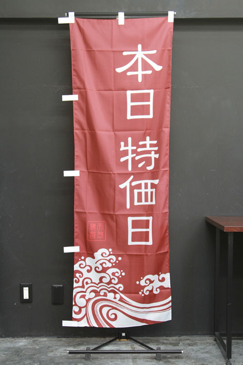 株式会社駒屋さまより文字変更のご注文をいただきました。 赤い地色に白抜き文字と波が印象的な和風のぼり旗です。 ↑こちらはレギュラーサイズの商品です。 元になったデザインはこちら▶ 青さのり(KAN067)