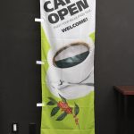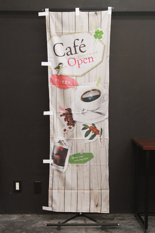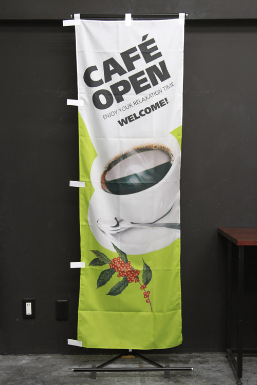 ハンバーグをはこぶユニーク・シェフと、具材のイラストをちりばめた『日替り定食やってます(ハンバーグ・黄緑)』のぼり旗です。