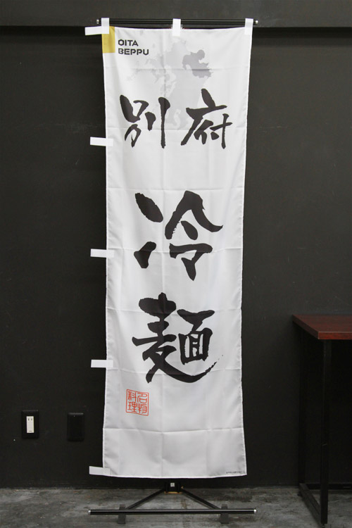 全国特産物のぼり「九州・沖縄」編。カラフルで親しみやすいデザインの「別府冷麺」 のぼり旗です。 大分県別府市で提供される冷麺です。麺は小麦粉、そば粉、でんぷんを基本としていて 魚介ベースの和風にアレンジされたスープが特徴です。 落款には「名物料理」の文字。 ↑こちらはレギュラーサイズの商品です。 商品ページはこちら▶ 別府冷麺(EOT303)