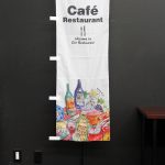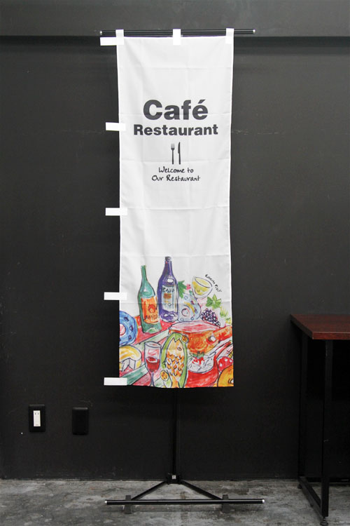 2色ストライプの背景が目を引く「Cafe open」のぼり旗です。