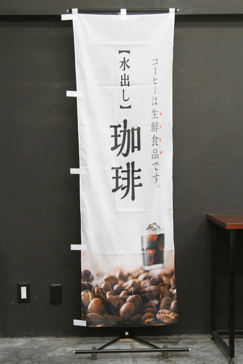 シンプルに文字とアイスコーヒーの写真を組み合わせた「冷製珈琲(アイスコーヒー)」のぼり旗です。どこか懐かしい少し控えめなデザインです。暑い日には最適ですね。 ↑こちらはレギュラーサイズの商品です。 商品ページはこちら▶ 冷製珈琲あります(白)(PAC231) ↑こちらはレギュラーサイズの商品です。 商品ページはこちら▶ 冷製珈琲あります(黒)(PAC232)