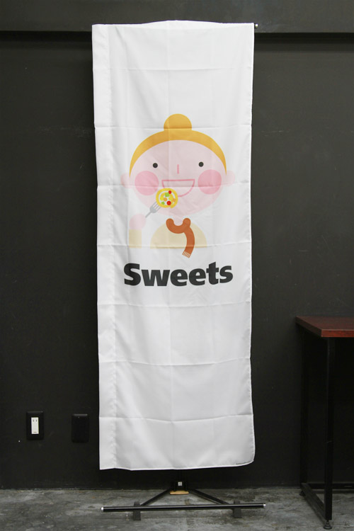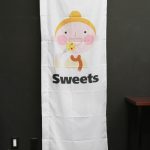 コーヒー豆とアイスコーヒーの写真を組み合わせた「水出し珈琲」のぼり旗です。「コーヒーは生鮮食品です。」の文章は自家焙煎が自慢のカフェオーナーさまからよくお聞きする言葉だったので採用してみました。