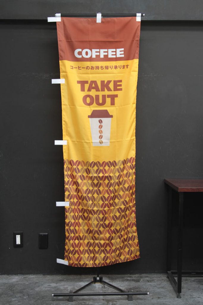 「カフェキッチン」のぼり旗です。カラフルな版画タッチのキッチン道具と野菜のイラストをあしらいました。Cafe Kitchenの文字が入っています。