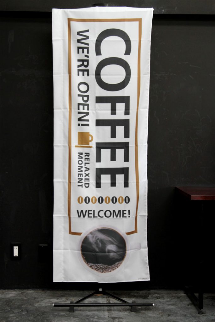 この「CAFE OPEN斜め文字」のぼり旗は営業時間中に掲げたいオーソドックスな商品です。コーヒーの写真、コーヒーの実のイラスト、ゴシック体の文字を斜めに配置した動きのあるデザインです。 ↑こちらはスリムショートサイズ、袋縫い加工の商品です。 商品ページはこちら▶ CAFE OPEN斜め文字(茶)(PAC751)