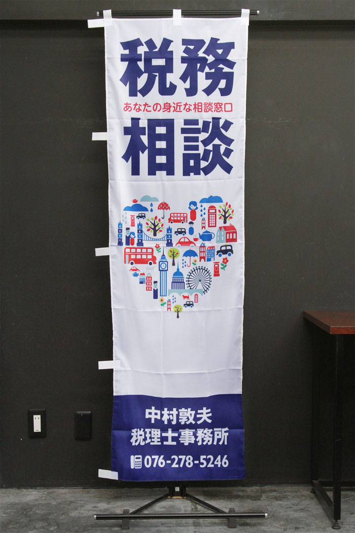 法律相談ののぼり旗。ハート型の町並みのイラストで、親しみやすさを伝えます。 中村敦夫税理士事務所さまからご注文いただきました。2色のくっきりとした コントラストで、見る人にも分かりやすいです。 ↑こちらはレギュラーサイズのタペストリーです。 商品ページはこちら▶ 【名入れのぼり】税務相談(SGY030)