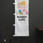 「cafe kitchen(カフェ キッチン)」のぼり旗です。カフェの台所に並ぶ調理道具の