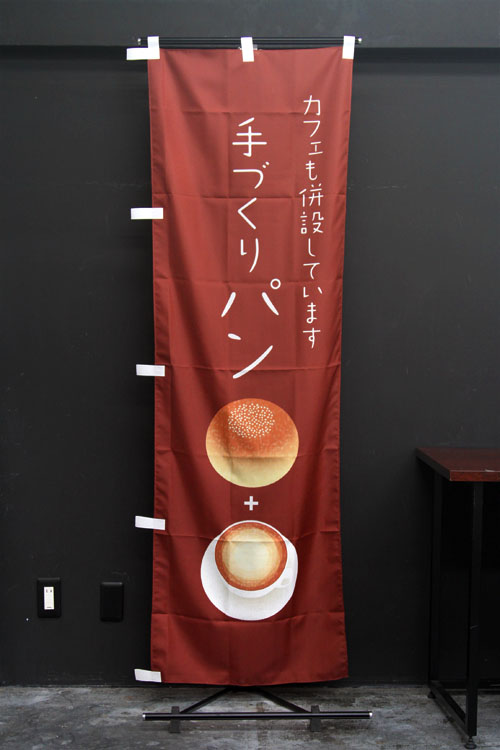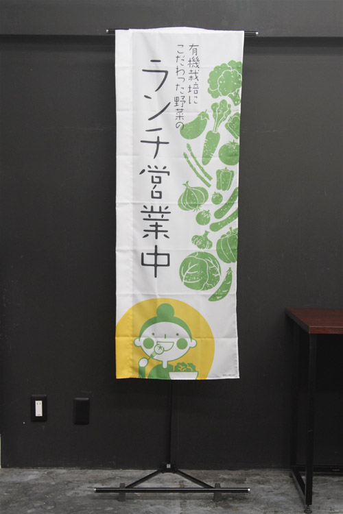 「マクロビオティックカフェ」のぼり旗です。 野菜・果物のイラストと、ご飯を食べるキャラクターをあしらいました。 ↑こちらはレギュラーサイズの商品です。 商品ページはこちら▶ マクロビオティックカフェ Macrobiotic Cafe(PAC459)