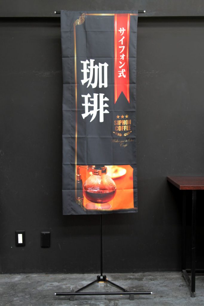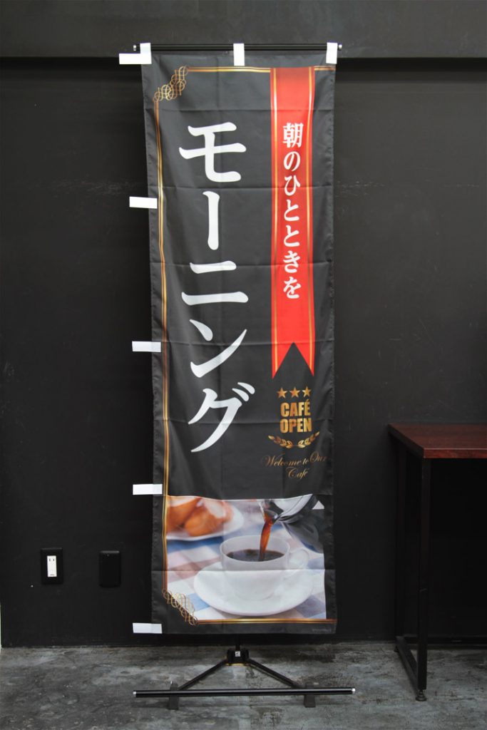 パン・カフェ喫茶シリーズ「自家焙煎珈琲」のぼり旗です。 赤いリボンの下に書かれているゴールドをイメージした文字は「COFFEE」 「Welcome to Our Cafe」です。 ↑こちらはスリムショートサイズの商品です。 商品ページはこちら▶ 自家焙煎珈琲(黒)(PAC830)