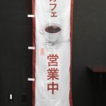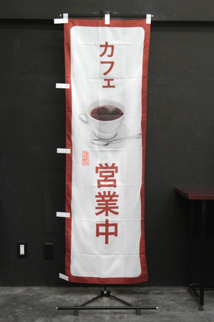 水玉模様を下地に、ほのぼのとした手描きのイラストが特徴ののぼり旗です。