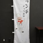 お料理をはこぶユニークシェフや女の子と、具材のイラストをちりばめた