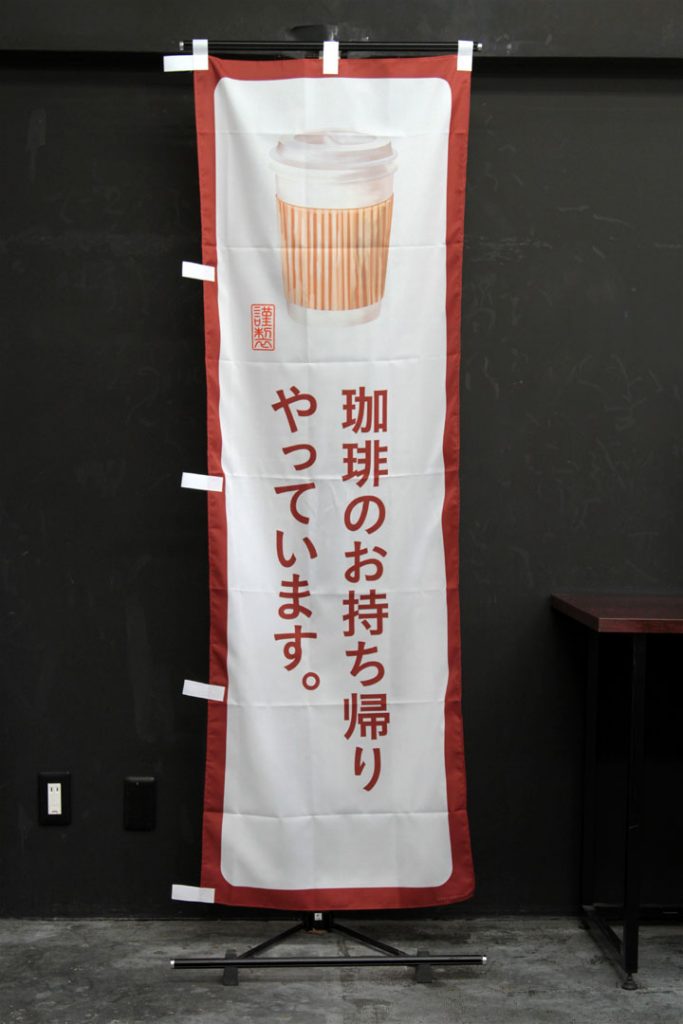 パン・カフェ喫茶シリーズ「贈り物(ギフト)に珈琲豆を。全国発送いたします。」 のぼり旗です。イラスト近くの落款には「謹製」の文字。 心をこめ、つつしんで作った製品との意味が込められています。 ↑こちらはレギュラーサイズの商品です。 商品ページはこちら▶ 贈り物に珈琲豆を。【角丸・白茶】(PAD171)