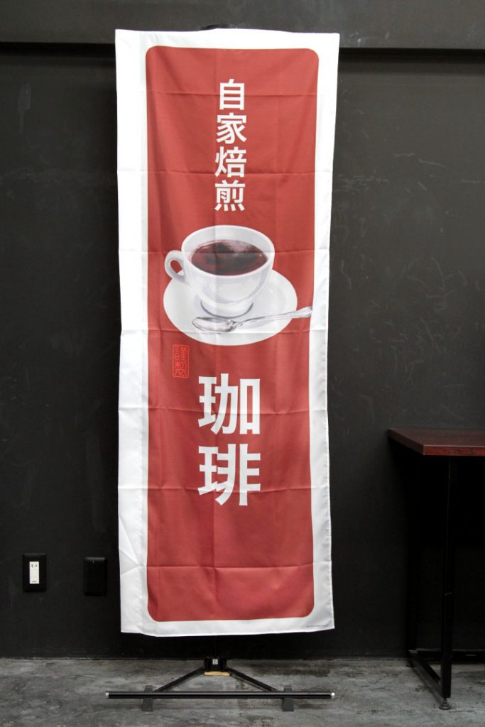 パン・カフェ喫茶シリーズ「珈琲お持ち帰り」のぼり旗です。 イラスト近くの落款には「謹製」の文字。 心をこめ、つつしんで作った製品との意味が込められています。 どこか優しいイメージののぼり旗がお客さまを出迎えます。 ↑こちらはレギュラーサイズの商品です。 商品ページはこちら▶ 珈琲お持ち帰り【角丸・茶白】(PAD162)