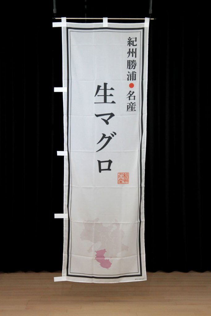 全国特産物のぼり「近畿」編。白地に「鯨の竜田揚げ」の文字が目立ちます。