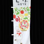 イタリアのイラストレーター、ロベルト・ピビリの作品を使用したのぼり旗です。ユーモラスで温かいイラストが目を引きます。英字は「We’re Open! Have a good time」です。