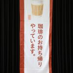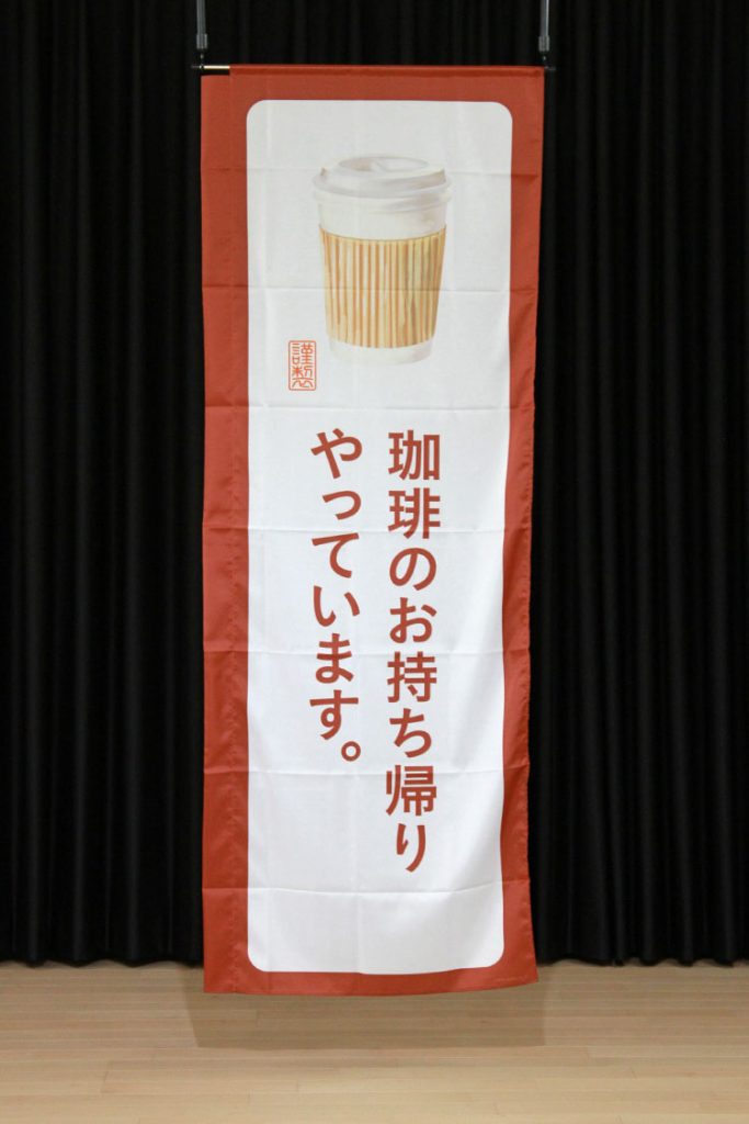 コーヒーののぼり旗。白地にポップなイラストで、すっきり仕上げました。