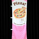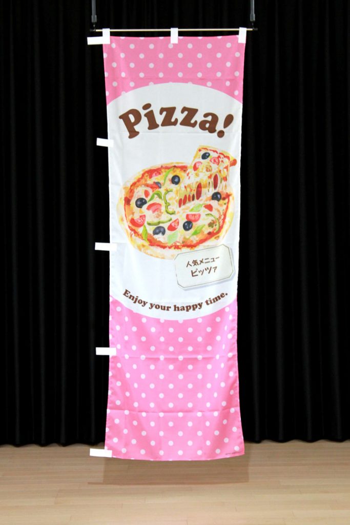 レストランや喫茶店などで幅広くご利用いただけるのぼり旗です。書かれている文章は「Pizza!」「Enjoy your happy time.」「人気メニューピッツァ」です。