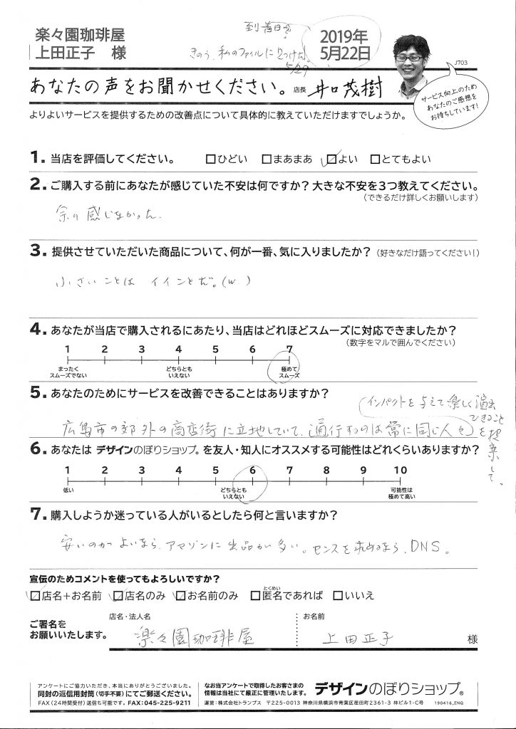 さらにのぼり旗を立ててみたところ、「カフェ利用が増え」、その効果をみて「安い」と感じられたとのこと。もっと「のぼり」を活用して、お客様が増える工夫をされたいとお考えなのですね。ご満足いただけて、とても嬉しいです!