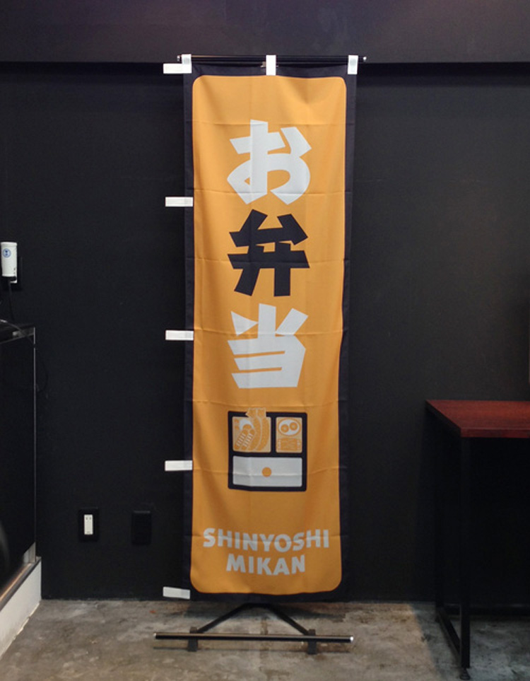 福岡県築上郡のお惣菜屋「しんよし みかん」さまから 「名入れ」のご注文を承りました。 当店オリジナルデザインのぼり旗(ホームページ掲載)は、 ご予算に応じて「お名前入れ」や「文字差し替え」が可能です。 元となった商品はこちら▶お弁当(LUN061)