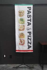 パスタ専門店コパン亘理店さまより完全データ支給ののぼり旗の 印刷・縫製のご注文をいただきました。 ↑こちらはスリムショートサイズ、袋縫い加工の商品です。