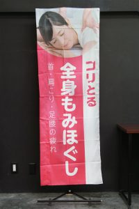 コリとる ぬちぐすい!!様からフルオーダーのぼり旗のご注文を承りました。 白とピンク色のコントラストがインパクトのあるデザインです。 上部に配置した写真で、一目で何のお店なのかが分かります。 ↑こちらはレギュラーサイズ、袋縫い加工の商品です。