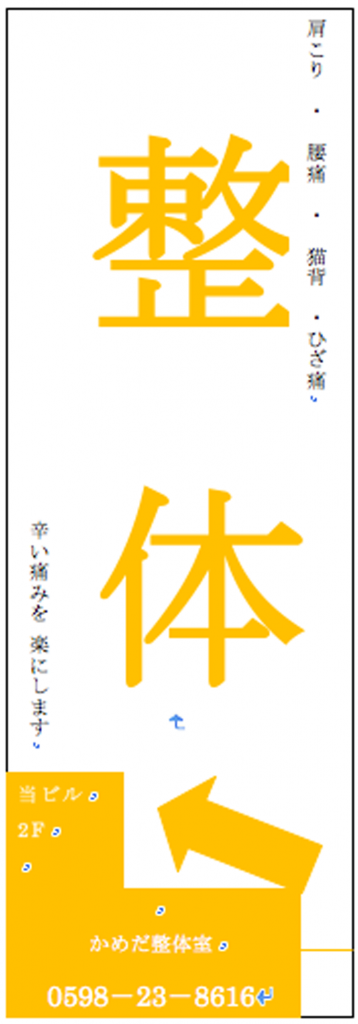 三重県松坂市の「かめだ整体室」さまよりご注文いただいた事例を紹介いたします。 ご注文時にイメージをWordで伝えていただきました。 その後、お電話で打ち合わせをさせていただきました。 ◎2階にお店があるので2階に誘導したい。 ◎安心感、清潔感を大事にしたい。 ◎車で通る方からも見やすくしたい。 お客さまにしっかりとしたイメージがあったので ラフ案を元に書体違いで3案制作して選ばれたのが下の写真です。 ブログを読むとわかりますが、誠実な印象を受ける整体院です。 常に勉強し続ける姿勢は、自分もぜひ見習いたいものです。 かめだ整体室ホームページへ