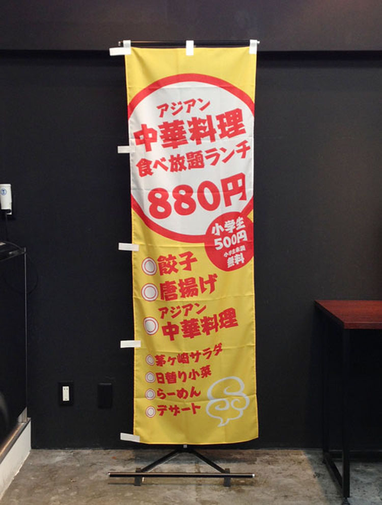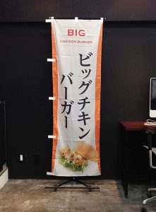 茅ヶ崎の加納食堂さまよりご注文いただきました。 ホームページを参考に親しみやすいデザインを目指しました。 ジャンボのぼり旗(900ミリ×2,700ミリ)です。 フルオーダーの料金に1枚あたり1,500円(税別)の追加で作成可能です。 大きすぎてのぼり旗の左右が隠れています。 加納食堂ホームページはこちら