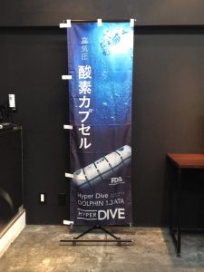 酸素カプセルののぼり旗をフルオーダーで制作いたしました。 商品の写真はご提供いただき、背景の海の写真は当店で用意しました。 商品の写真が入るとグッとオリジナリティーがアップしますね。