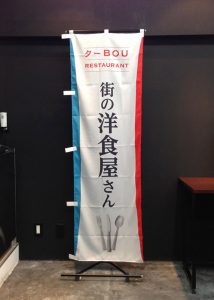 街の洋食屋さんのぼり旗です。 今回は2枚のデザインを合わせたものになっています。 ベースのデザイン、街の洋食屋さん(YOS011)に 街の洋食屋さん(YOS029)の写真を使用しました。 これだけでオリジナルなのぼりが出来ました!