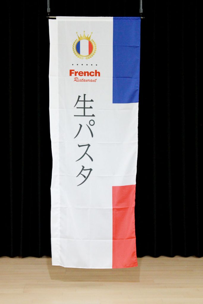 世界の料理シリーズ、ヨーロッパ・北米、フランス編「◯◯◯料理名」のぼり旗です。フランスの料理名などを取り揃えております。国旗のアイコンの下に書かれている赤い文字は「French Restaurant」です。