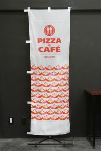 ピザをはこぶ女の子と具材のイラストをちりばめた『ピザのお店です』のぼり旗です。 ↑こちらはレギュラーサイズの商品です。 商品ページはこちら▶ ピザのお店です(女子)(YOS602)