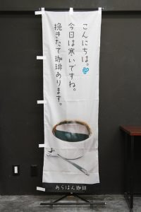 寒〜い日にこんなのぼり旗があったら暖をとりに入店するかも?という思いで デザインを制作いたしました。 高知県の道の駅大月にある「まぁるいお月さん」さまより 名入れのご注文いただきました。 ↑こちらはレギュラーサイズの商品です。 商品ページはこちら▶挽きたて珈琲あります。(PAC212) 群馬県の「あらはん珈琲」さまより名入れのご注文いただきました。 ↑こちらはレギュラーサイズの商品です。 商品ページはこちら▶挽きたて珈琲あります。(PAC212)