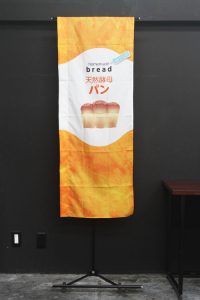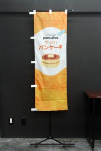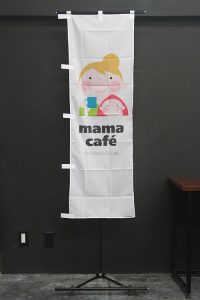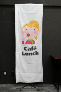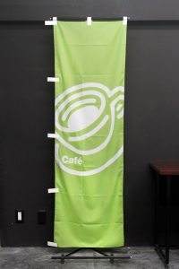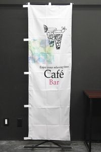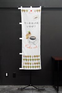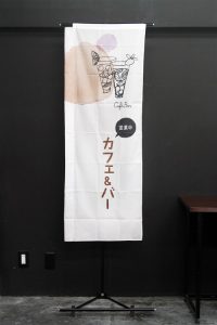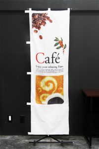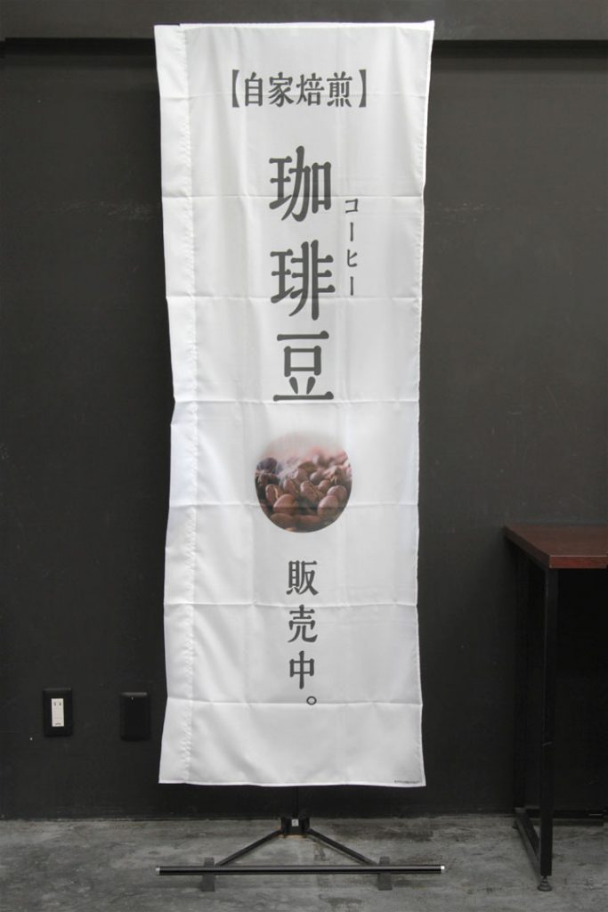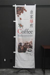 魅力的な写真と、コーヒーの花実のイラストを組み合わせたお洒落なのぼり旗です。