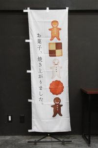 シンプルで文字が目立つ「マカロン」のぼりです。白地に大きい写真使いで目を引きます。マカロンのアイコンがポイントになっています。英字は「Macaron」です。