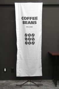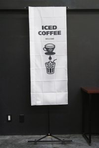 シンプルで文字が目立つ「アイスコーヒー」のぼりです。白地に大きい写真使いで目を引きます。コーヒー豆のアイコンがポイントになっています。英字は「Iced Coffee」です。