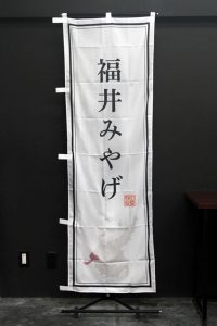 既製デザインの特産物シリーズ、福井県ののぼり旗です。 白地に地図と文字のシンプルなのぼり旗ですので、文字が目立ちます。 同じデザインで並べると目を引いて効果バツグンです。 商品ページはこちら▶福井みやげ(DFI101) 商品ページはこちら▶ソースカツ丼(DFI103) 商品ページはこちら▶鯖のへしこ(DFI109) 商品ページはこちら▶福井地酒(DFI116) 商品ページはこちら▶越前焼(DFI118)