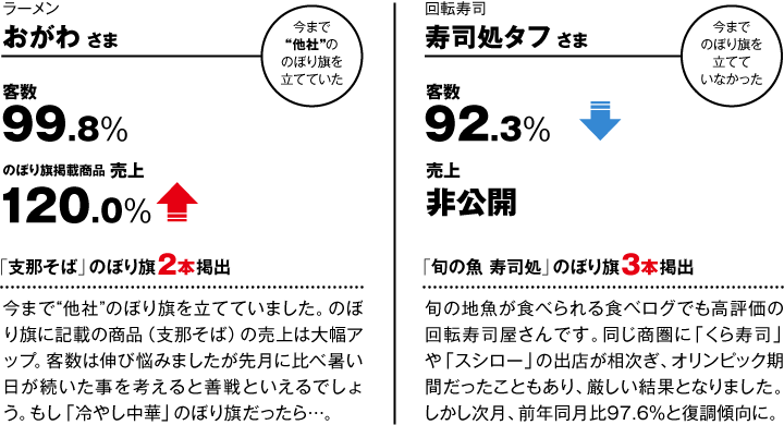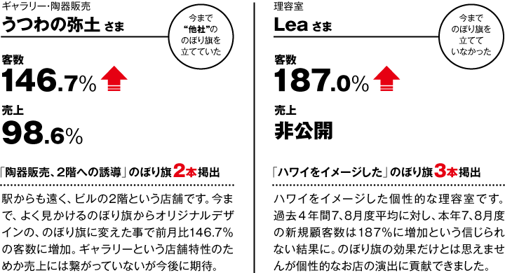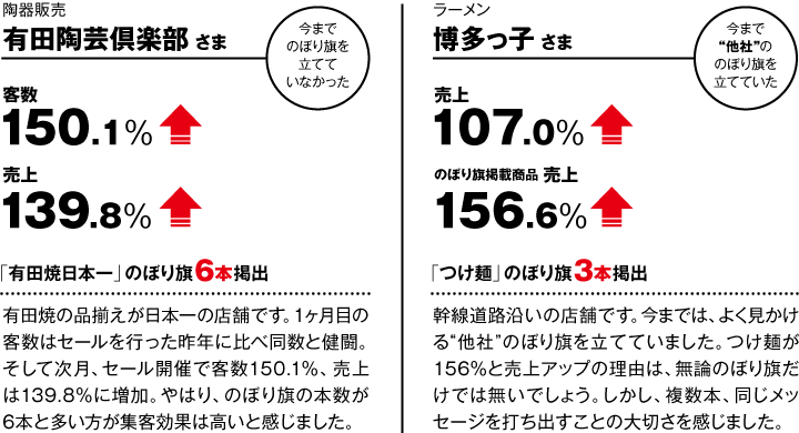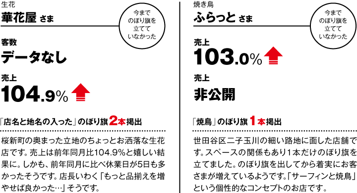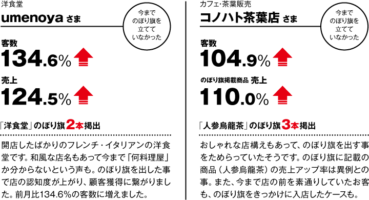 *当店オリジナルのぼり旗を立てる前1ヶ月と掲出後1ヶ月の比較。前年のデータがある店舗は前年同月比。2012年4~7月末調査。