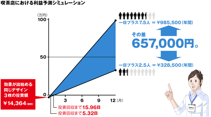 客単価600円、原価率を高めに設定し40%だとします。1人あたり360円の粗利です。粗利360円×30日=10,800円×12ヶ月=年間129,600円のプラスです。「のぼり旗」の価格の元が取れるのは、あっという間ですね。