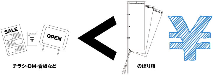 “ありきたりなデザイン=ありきたりなサービス”とのイメージを消費者が学んでしまったのです。しかし、費用対効果は他の広告物(看板、電子広告)と比較しても未だダントツなのです。その証拠に多くのチェーン店や企業は“オリジナルデザイン”の、のぼり旗を多用しつづけています。そしてほとんどのお店で30日以内に元がとれていることは、あまり知られていません。