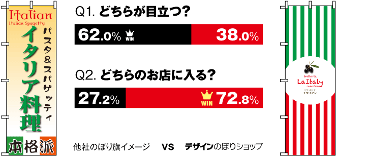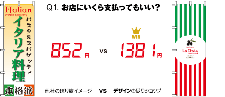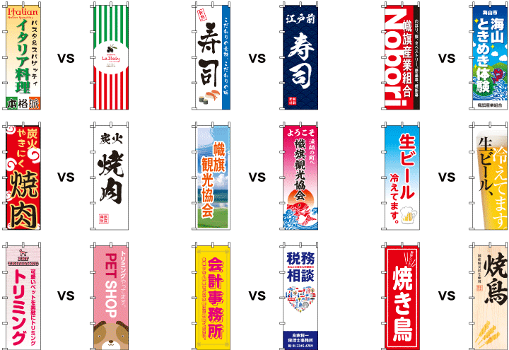 目立つ」ことは大事なことです。しかし、「目立つ」けど「入りたくない」、つまり「ありきたりな」デザインだと思われたらそれは、ほとんど“効果のない”のぼり旗です。もし、あなたのお店が「目立つ」けど、ありきたりな「入りたくない」のぼり旗を立てていたとしたら、それはお店を“逆宣伝”しているようなものです。