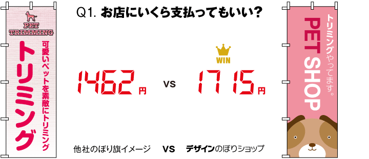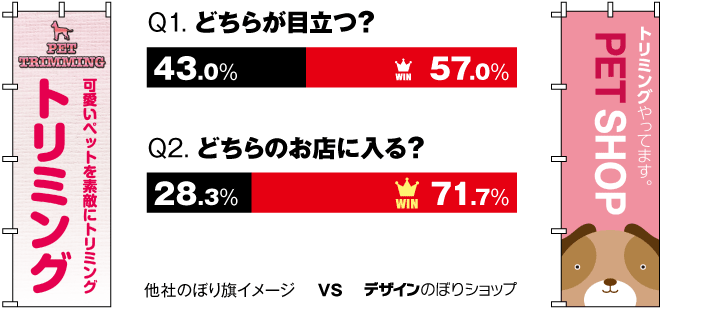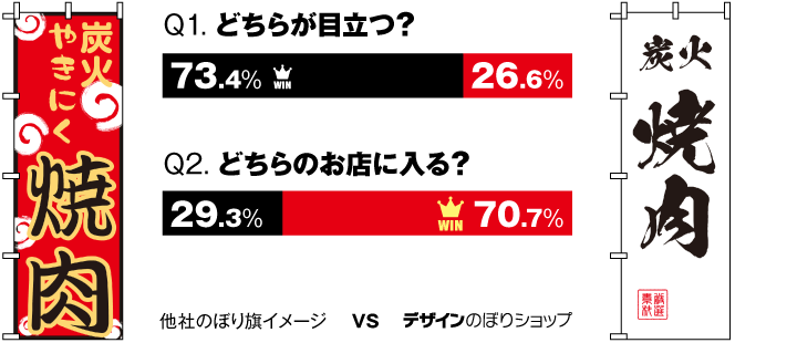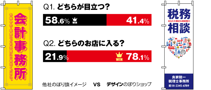 当店では、アンケート結果を元におよそ3倍の反応を目ざしています。元が取れるまでの期間は1/3、利益は3倍。ぜひ使用前と後の集客数の記録をとってみてください。このアンケート(ブラインド・テスト)の7対3以上の差というのは、理論上、隣りどうしのライバル店舗が集客数を勝負したら約3倍の差になってしまう威力を持っています。それほどデザインは大切だということです。