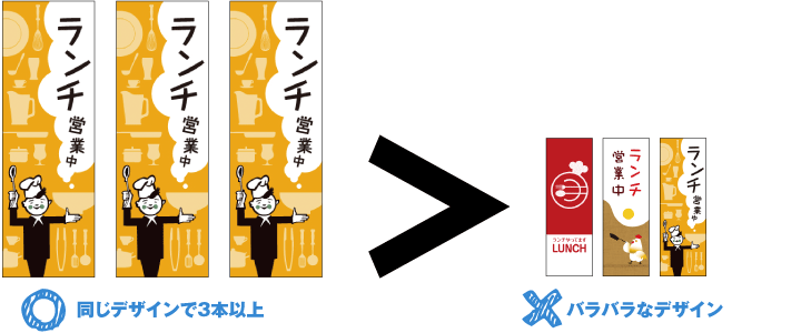 それが分かっているファミレス、コンビニは必ずといっていいほど同じデザインの「のぼり旗」を複数本立てています。大手企業のやることが全て正しいわけではありませんが「のぼり旗」の立て方に関しては間違いありません。もし、あなたのお店がバラバラな「のぼり旗」を立てているなら、今すぐどれか1つに絞ることをお勧めします。どうしても訴求したいポイントが多い時は、同じデザインで文字だけ変えると良いでしょう。