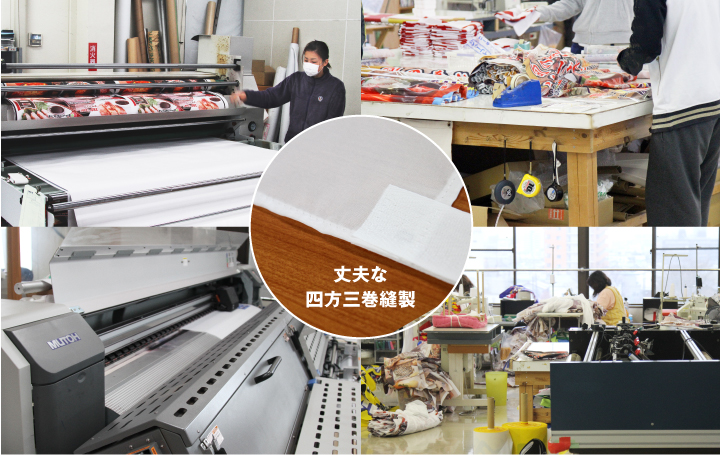 ヒートカット(熱による裁断、縫製なし)が全盛の中で、当店は標準仕様でL字縫製を取り入れていたのですが、海沿いのお客さまから「のぼりが裂けてしまった」とのご報告を受け、当店はすべての辺を縫製する【四方三巻縫製】を標準仕様としております。