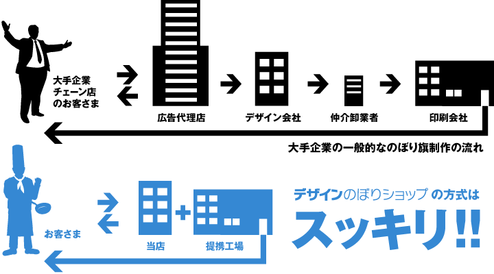 イイなぁと感じるのぼり旗は、だいたいデザイン会社が作っています。ホントです。多部数の、のぼり旗の多くは広告代理店を通してデザイン会社に発注されます。もちろん業者が増えれば費用がかさむのは当り前ですよね。
