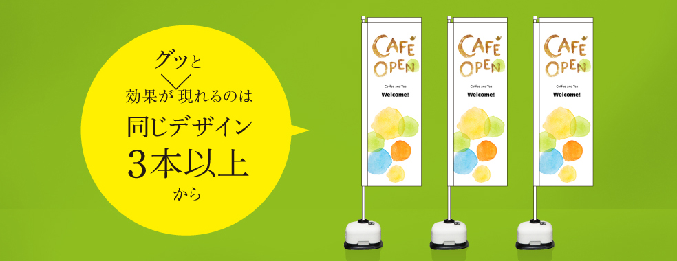 そして、元をとるためにはどの位の期間が必要なのでしょうか?仮に既製デザインのぼり旗(袋縫い仕様)を3枚とポールを3本購入して180日間(6ヶ月間)立てるとします。その際にズバリ、1日あたり139.8円以上利益が増えるならば元が取れます。先ほどの喫茶店の例を出してみましょう。