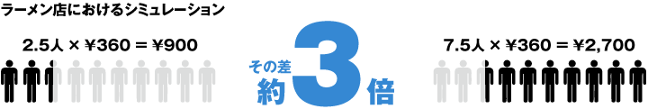 平均客単価600円、原価率を高めに設定して40%、一人あたりの粗利360円として計算します。のぼり旗を立てることにより、一日プラス2.5人の集客で900円。一日プラス7.5人の集客だと2,700円です。一日でその差は1,800円にもなります。10日で18,000円、100日で180,000円。一年後にはなんと、657,000円にもなってしまいます。